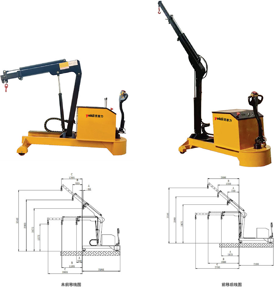 ● 電動行走,液壓起升,液壓前移,液壓前伸多功能一體化平衡重式全電動單臂吊, 車架人性化設計,可根據自身情況隨意調整高度和角度,使用方便省時省力提高工作效率。